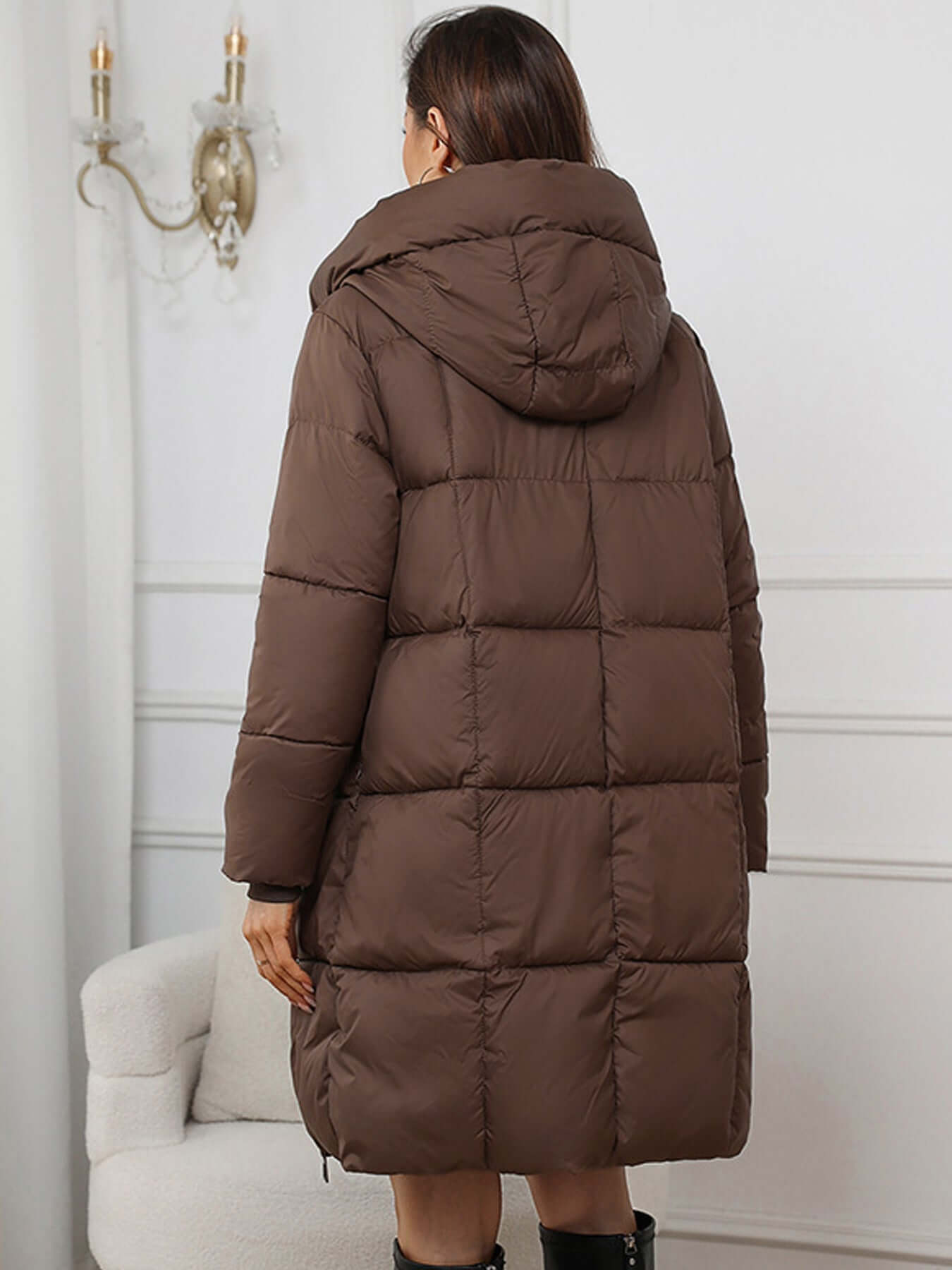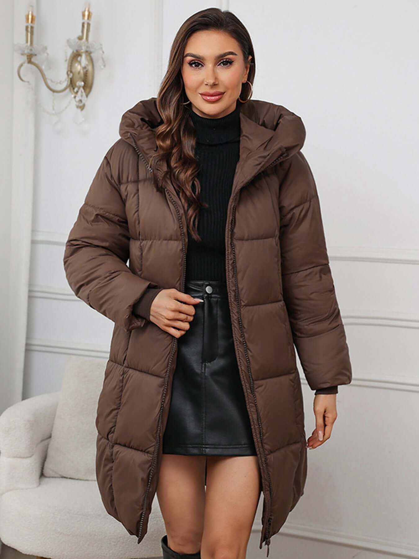 This long hooded puffer coat is designed to keep you warm and stylish throughout the winter months. Its sleek silhouette and functional features make it the perfect addition to your wardrobe.