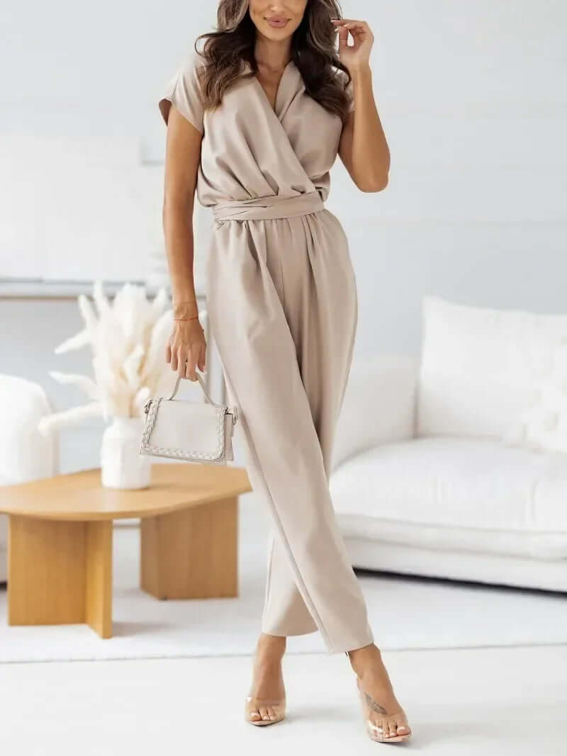 Elevate your wardrobe with this effortlessly chic jumpsuit. The flattering wrap V-neckline and tailored fit create a sleek and sophisticated silhouette, while the short sleeves and belted waist add a touch of modern elegance. Perfect for both casual and semi-formal occasions.