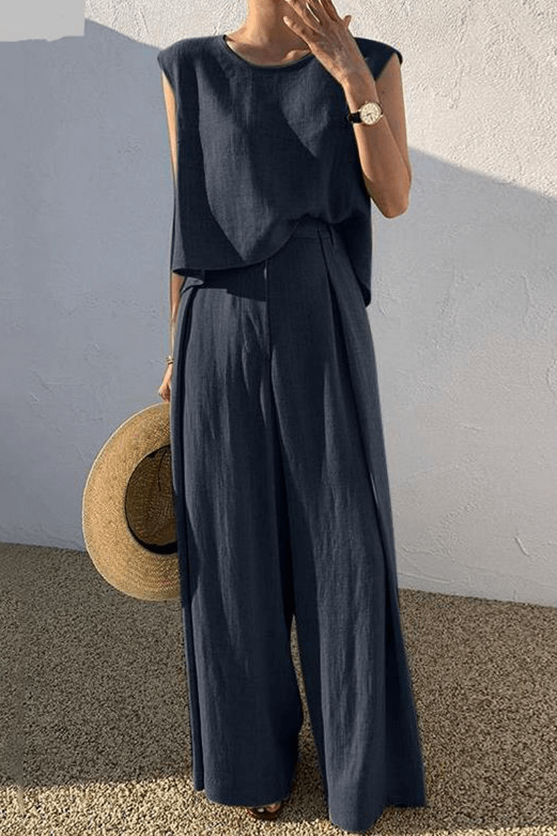 Discover the epitome of understated style with this versatile two-piece ensemble. Crafted for comfort and designed with a contemporary aesthetic, this outfit transitions seamlessly from casual daytime outings to relaxed evening gatherings. The loose-fitting top and wide-leg trousers combine to create a look that's both chic and comfortable.