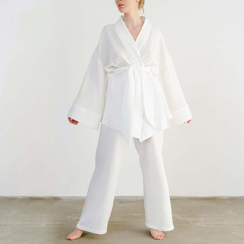 Discover the perfect blend of comfort and style with this versatile two-piece set. Featuring a flattering V-neck top with a tie waist and relaxed, wide-leg trousers, this ensemble is crafted from a lightweight, breathable fabric, ensuring all-day comfort.